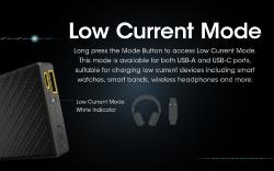Ce mode convient à la charge d’appareils à faible courant, y compris les écouteurs sans fil, les casques sans fil et plus encore. Appuyez longuement sur le bouton Mode pour activer l’indicateur blanc et accéder au mode Courant faible. Appuyez longuement sur le bouton Mode pour désactiver l’indicateur blanc et quitter le mode Courant faible. (Il est recommandé de quitter le mode courant faible une fois le processus de charge à faible courant terminé, car ce mode ne s’éteindra pas automatiquement.)