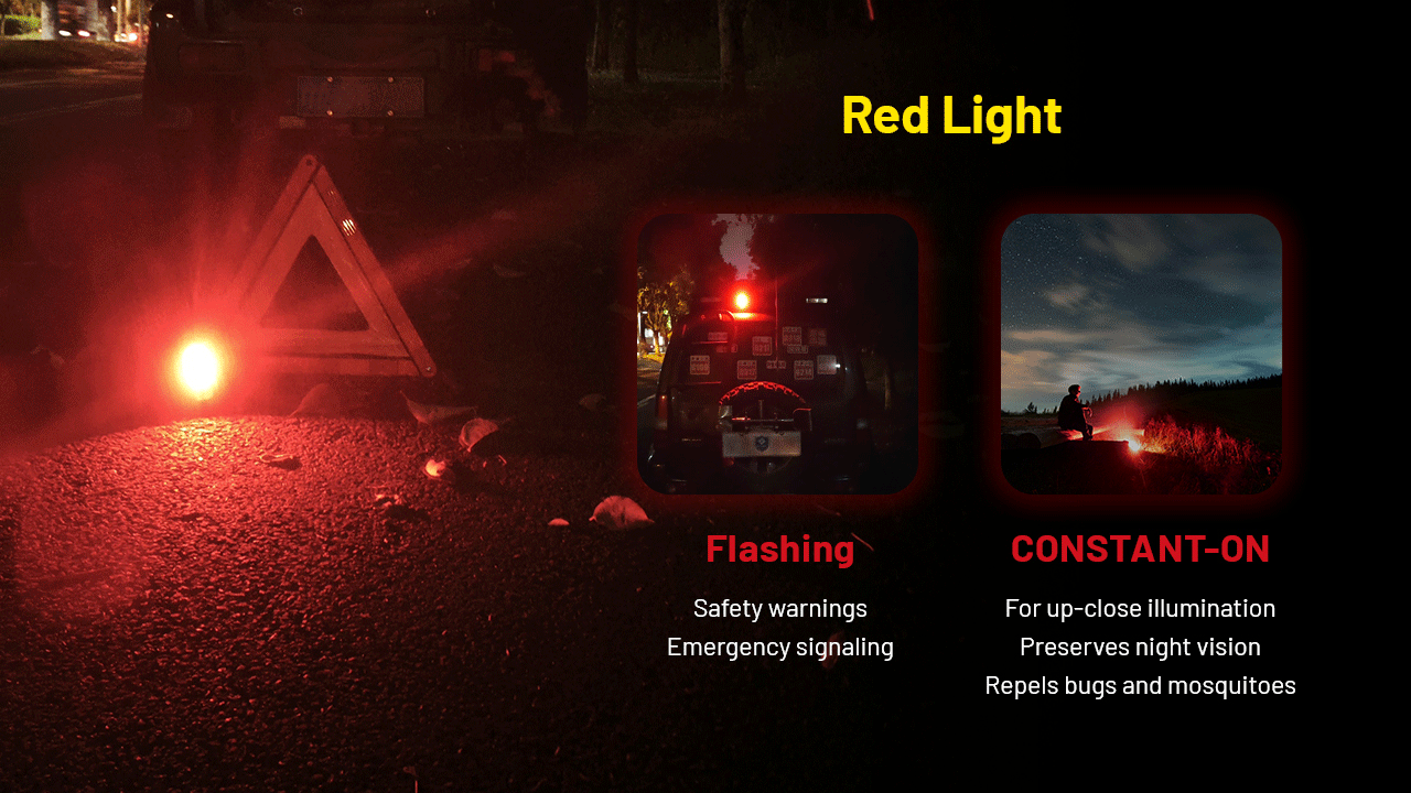 - Lumière rouge conçue pour préserver la vision nocturne ; Clignotant rouge conçu pour les avertissements d'urgence