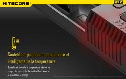 Compatible avec les Flat top 21700, 18700 et 20700. INPUT : AC 100-240V 50/60Hz 0,35A(MAX) 10W DC 12V 1A. OUTPUT : 4.35V±1%/4.2V±1%/ 3.7V±1%/1.48V±1% - 1.5A ×1 / 0.75A×2 / 0.5A×2 / 0.375A ×4. Detection automatique sur chaque emplacement. Indicateurs de charge, arrêt automatique en fin de charge. ATTENTION: Ce chargeur ne peut pas recevoir les 21700 de chez Nitecore à cause de leurs protections, nous vous conseillons les nouveaux modèles (UI1, UI2, UM2, UM4, UMS2, UMS4, Q2, Q4)